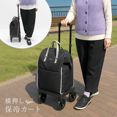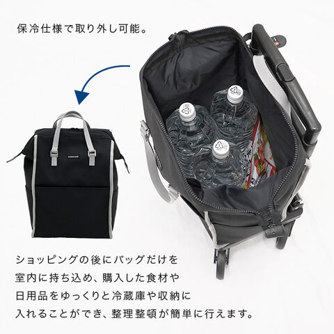 バッグ部分は保冷仕様で取り外し可能。ショッピングの後にバッグだけを室内に持ち込め、購入した食材や日用品をゆっくりと冷蔵庫や収納に入れることができ、整理整頓が簡単に行えます。