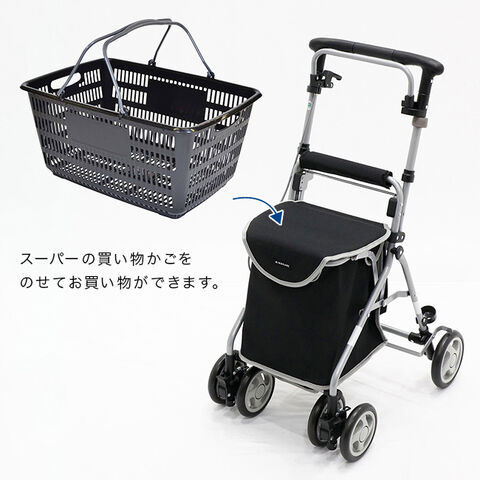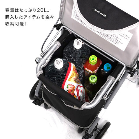 食材や日用品はもちろん、上着や飲み物など外出時の持ち物もまとめて収納できます。さらにスーパーの買い物かごを載せられるので、店内での移動もスムーズです。