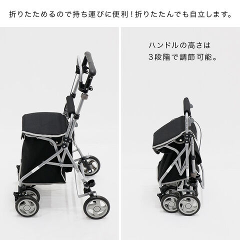 持ち手は身長に合わせて3段階に調整可能。折りたたむと自立するため収納にも困らず、車への持ち運びもスムーズです。