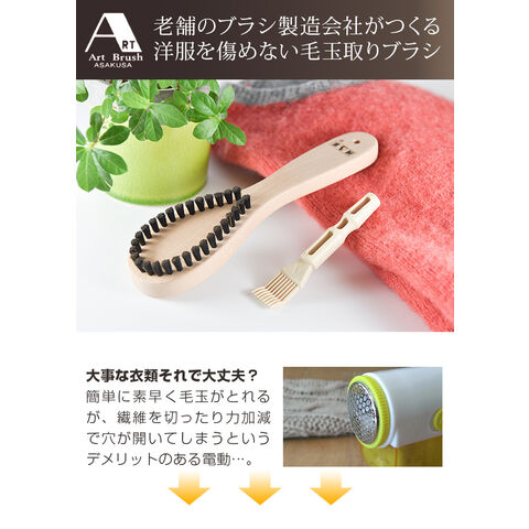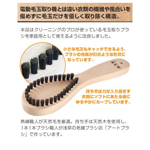 老舗のブラシ製造会社がつくる洋服を傷めない毛玉取りブラシ。電動毛玉取り機とは違い、衣類の繊維や風合いを痛めずに毛玉だけを優しく取り除く構造の毛玉取りです。本品はクリーニングのプロが使っている毛玉取りブラシを家庭用として使えるように改良しました。熟練職人が天然毛を厳選。持ち手は天然木を使用し、1本1本ブラシ職人が浅草の老舗ブラシ店「アートブラシ」で作っています。ブラシ本体も傷めず、絡まった毛玉を取り除く専用クリーナー付き。コートやウールの毛玉とりにおすすめの毛玉とりブラシです。