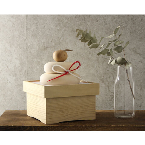 【素材】鏡餅:国産イチョウ、橙:国産けやき、葉:国産黒柿、収納台:国産栗