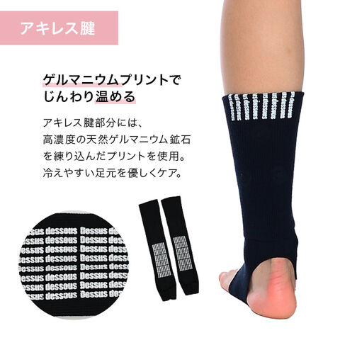 アキレス腱部分には、高濃度の天然ゲルマニウム鉱石を練り込んだロゴプリントを使用。肌に触れることでぬくもりを感じやすく、冷えやすい足元をやさしくケアします。(タイツの上に着用した場合も効果は変わりません。)