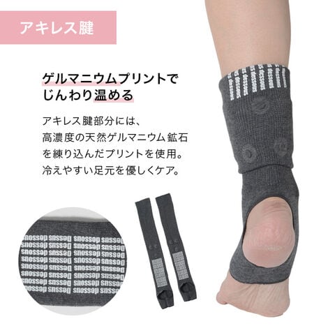 アキレス腱部分には、高濃度の天然ゲルマニウム鉱石を練り込んだロゴプリントを使用。肌に触れることでぬくもりを感じやすく、冷えやすい足元をやさしくケアします。(タイツの上に着用した場合も効果は変わりません。)