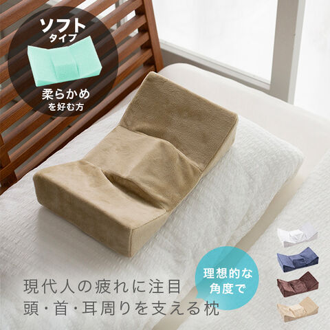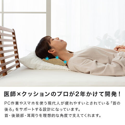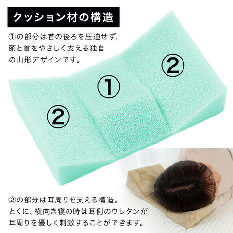 非対称カーブ構造で首の圧迫を防ぎ、横向き時は耳周りを適度に刺激します。
