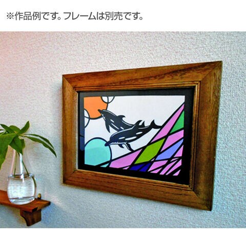 B5(ノートサイズ)のイルカ・ばら・しまうまとポストカードサイズのあやめ・舞妓の絵柄が5種類ついてきます。B5は大きめなので、初めて切り絵にチャレンジする方にはオススメです。お気に入りのフレームに入れて飾って下さい。