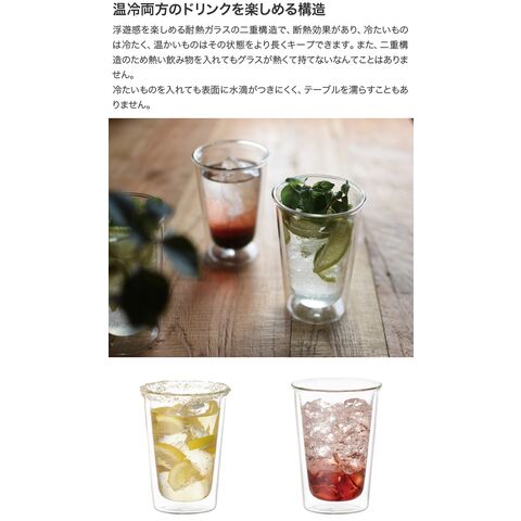 浮遊感を楽しめる耐熱ガラスの二重構造で、断熱効果があり、冷たいものは冷たく、温かいものはその状態をより長くキープできます。また、二重構造のため熱い飲み物を入れてもグラスが熱くて持てないなんてことはありません。
