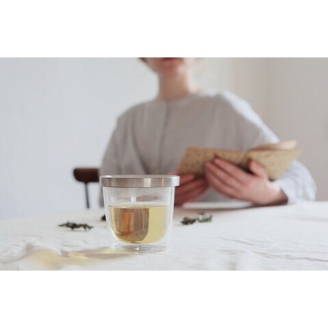 浮遊感を愉しめる耐熱ガラスの二重構造で、断熱効果があり温かいものをよりキープ。蓋は熱くなりにくい構造で、ストレーナーやティーバッグレストとしてもお使いいただけます。
