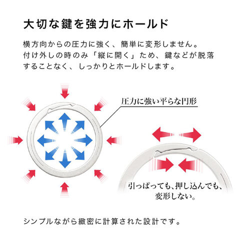 横方向からの負荷に強く、変形しにくい仕組みで、大切な鍵をしっかりホールドします。