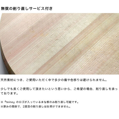 【その他】無償の削り直しサービス付き(1回) ※厚みの関係で、2度目の削り直しはお受けできません。 ※『teine』のロゴが入っているまな板のみ削り直し可能です。 ※ご希望の方は同梱の冊子をご確認下さい。