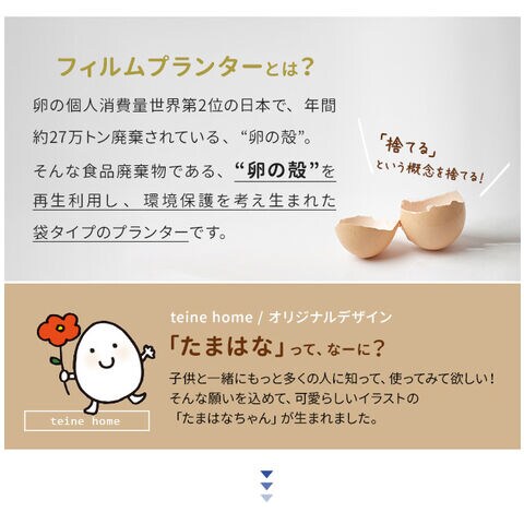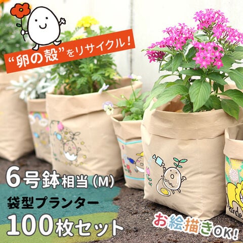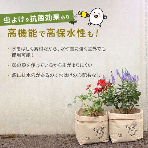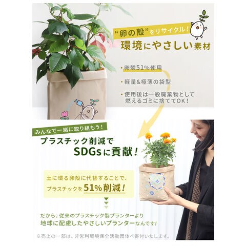 プラスチックの使用を抑え、卵の殻を51%配合してつくられた、地球にやさしい袋型の「卵の殻プランター」です。