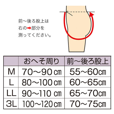 【サイズ(約)】[Mサイズ]おへそ周り:約70~90cm・前~後ろ股上:約55~60cm [Lサイズ]おへそ周り:約80~100cm・前~後ろ股上:約60~65cm [LLサイズ]おへそ周り:約90~110cm・前~後ろ股上:約65~70cm [3Lサイズ]おへそ周り:約100~120cm・前~後ろ股上:約70~75cm