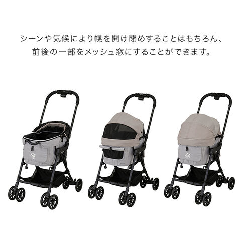幌の前後とキャリー前方に合計3カ所のメッシュ窓を備えており、通気性抜群。キャリーは取り外して丸洗いできるので、いつでも清潔に保てます。