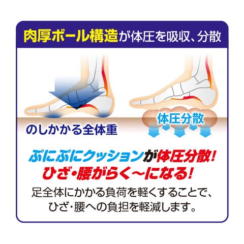 足裏にかかる体重圧を広く分散し、足元環境をサポートします。