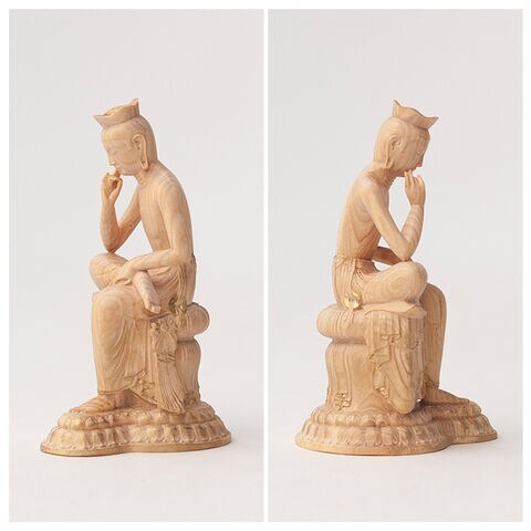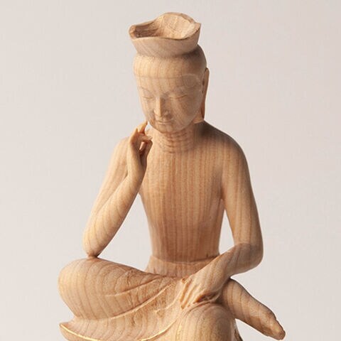 本作「弥勒菩薩」は、国宝「木造弥勒菩薩半跏像」をモチーフに制作。右足を左膝に乗せ、頬に手を添えた“思惟の姿”で知られるこの像は、約1400年前に造られたにもかかわらず、柔らかい微笑「アルカイックスマイル」と静謐な気配で、今なお多くの人々の心を癒し続けています。古来より弥勒菩薩は、未来に人々を救う“未来仏”として深い信仰を集めてきました。現代では、心の安寧や癒しの象徴として、そっと寄り添ってくれる存在として親しまれています。