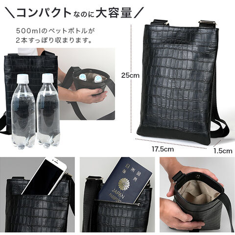 ■文庫本・パスポート・スマホ・財布…必要なものがしっかり入る収納力。マチなし設計なのに、なんと500mlペットボトルが2本入る柔らかさも魅力。