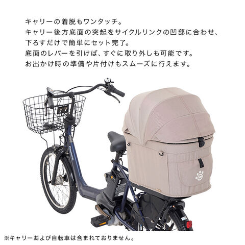 【備考】・自転車に載せる際のペットの上限体重は15kg以下となります。 ・ペットを乗せて自転車で走行する場合は、十分注意して走行してください。 ・ご購入前にご自身の自転車にサイクルリンクが装着可能かどうかを予めご確認ください。 ・ペットキャリーのキャリーベルトは外してから自転車に装着をしてください。