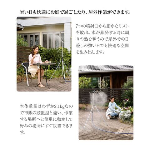 7つの噴射口から細かなミストを放出。水が蒸発する時に周りの熱を奪うので屋外での日差しの強い日でも快適な空間を生み出します。