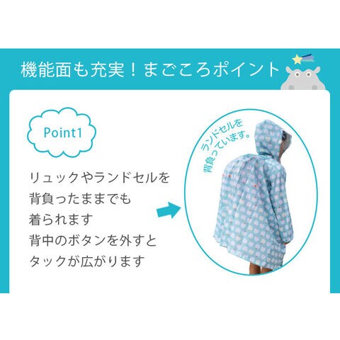 背中のボタンを外すとタックが広がり、リュックやランドセルを背負ったままでも着用することができます。内側にはスナップボタンが付いていて脱いだり着たりがらくちん。