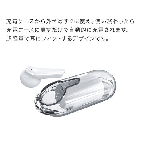 軽量設計で耳にフィットする形状なので、長時間使用しても疲れにくいのも嬉しいポイントです。タッチするだけで音量を5段階で調節可能。左右独立型なので、片耳だけでも使えます。1回の充電で最大17時間の使用が可能。「ノイズキャンセリング機能」搭載。