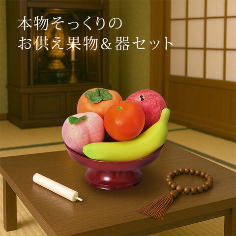 まるで本物。だけど、傷まない。お盆や毎日のお仏壇のお供えに、いつまでも美しく飾れる、本物そっくりのフェイク果物セットです。