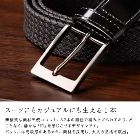 組紐ベルト 與三七 35mm 黒 64150(ベルト メンズ 本革 穴なし 日本製 おしゃれ メッシュベルト 編み込み ウエスト 無段階)
