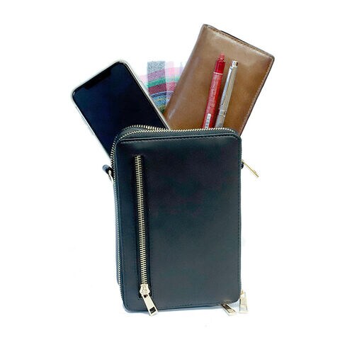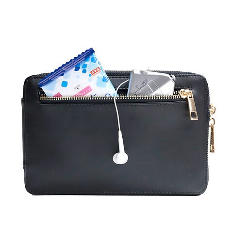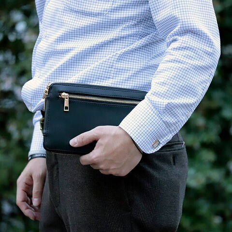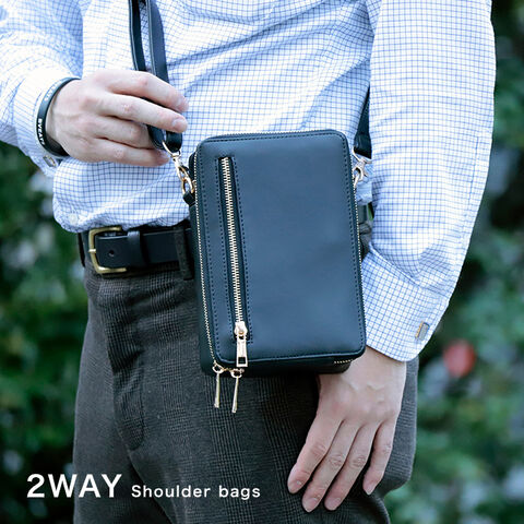 スマートフォンや手帳を収納できるメインポケット、ハンカチやイヤホンを収納する前面ポケット、財布代わりにも使えるラウンドファスナーポケットを搭載しています。