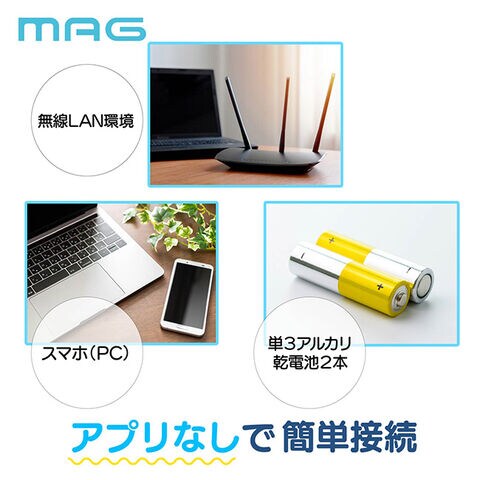 【仕様】[無線方式]2.4GHz(5GHz非対応) [セキュリティ]WPA/WPA2(WPA3非対応) [使用電池]単3形アルカリ乾電池×2 [電池寿命]約1年 [使用温度範囲]0~40度(結露不可)