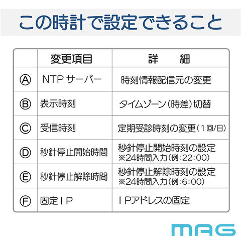 【機能】無線LAN、NTPサーバ指定可能、タイムゾーン設定(UTC地域名選択)、ステップ秒針、指定時間秒針停止機能、電池交換お知らせ機能(秒針の動きでお知らせ)