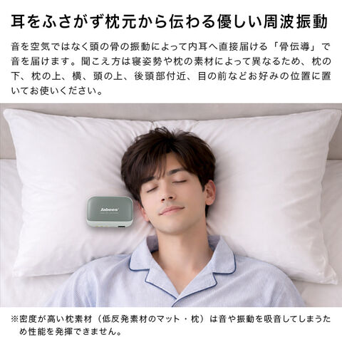 【注意】※密度が高い枕素材(低反発素材のマット・枕など)では性能を発揮できない場合がございます。※本製品は骨伝導による再生であり、従来のスピーカーのようなどこに置いても大きな音が出るスピーカーではございません。※低音が強調される音源や低音ボイスは商品の特性上聞き取りにくい場合がございます。