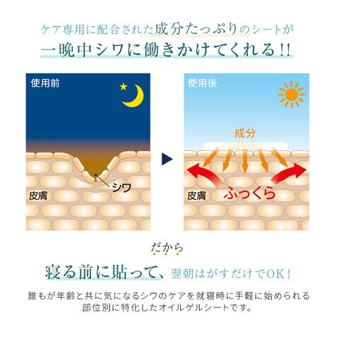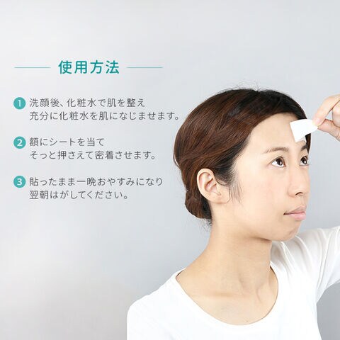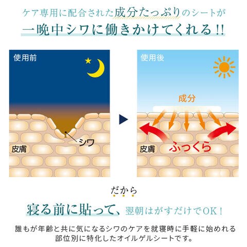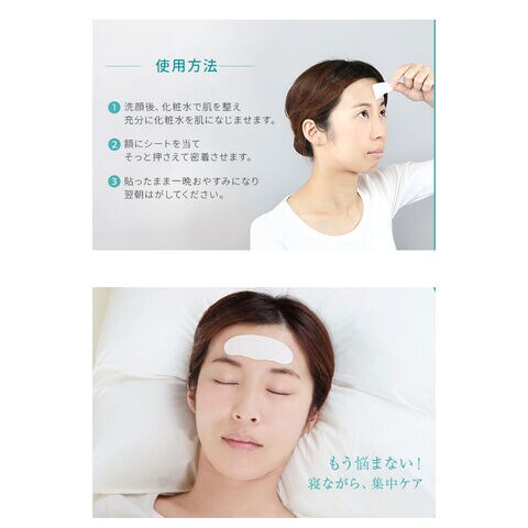 セラミド、コメヌカ油、ヒアルロン酸、コラーゲンと額のシワに特化した美容成分たっぷりのオイルゲルシートが一晩中シワに働きかけてくれるので、翌朝はがすと額のシワがスッキリします。