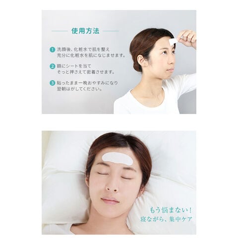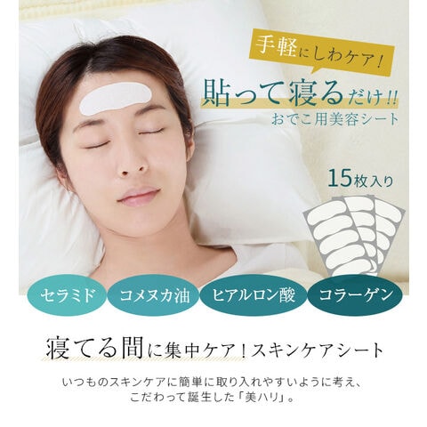 寝る前に貼って、翌朝はがすだけ。おでこに合わせた形状の美容シートです。