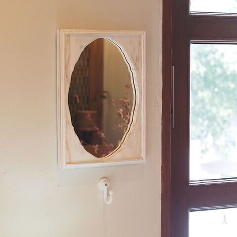 リビング、玄関、廊下、トイレ…さまざまな場所に設置するこで、インテリアのポイントになります。壁掛け、立てかけどちらのスタイルでもお楽しみいただけます。エイジング加工の風合いを出すため、白の塗装を塗ってから、サンドペーパーをかけ、まるで長い年月を経て味わいが出やようなアンティーク調の雰囲気に仕上げています。とくにホワイトは元の木目や、色の濃淡が影響して、赤みや茶色みが表れるので、よりシャビーシックな雰囲気を味わえます。