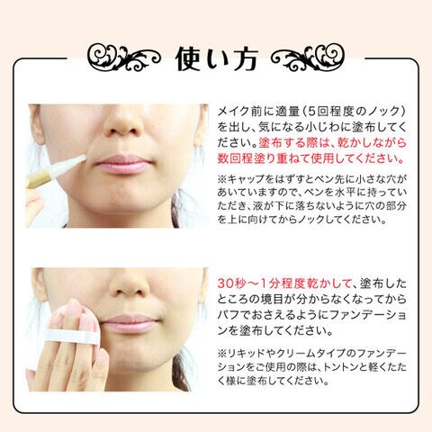 【使用方法】・メイク前に、気になるシワ部分(目元・口元・おでこなど)に適量(ノック5回程度)を塗布します。 ・乾かしながら数回重ね塗りします。 ・30秒~1分程度乾かしてから、ファンデーションを軽くトントンと重ねてください。