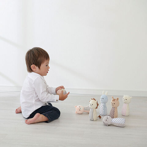 ねんね期には音を聴かせたり、「追視」を促す遊びに。ハイハイ期にはボールを追いかけたり、おすわり期には投げてピンを倒す楽しさも。