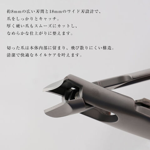 上刃と下刃の間隔は8mm。爪をしっかり収めて滑りにくく、横幅18mmのワイド刃で大きめの爪も気持ちよく切れます。