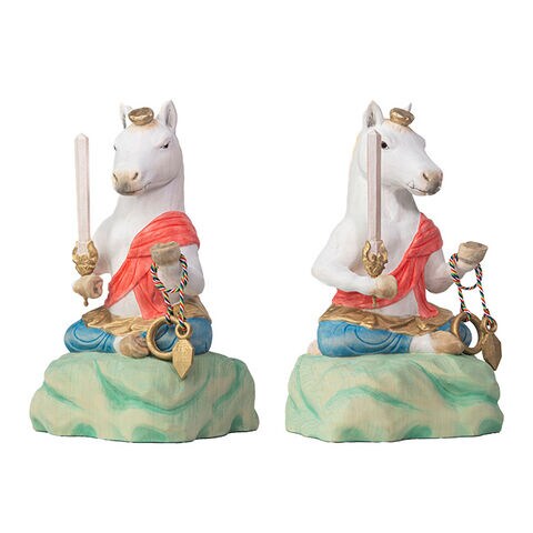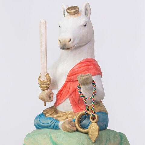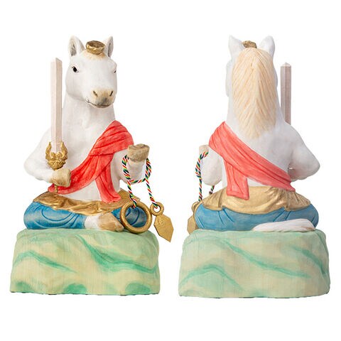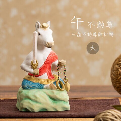 午不動尊は、その勇壮な馬の姿に不動明王の威厳を重ね合わせたご尊像です。燃えるような赤い袈裟と、手にした剣や羂索(けんさく)は、迷いや悪縁を断ち切り、良縁と繁栄を招く象徴。午年生まれの方の守り本尊としてはもちろん、勝負運を願う方、新しい挑戦に向かう方への贈り物にもふさわしい逸品です。