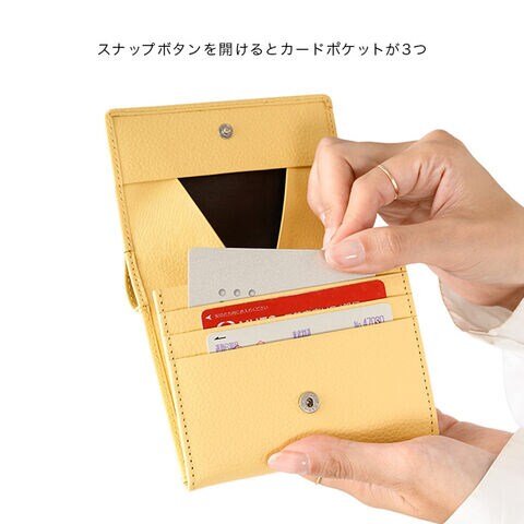 ・スナップボタンを開くと、小銭入れが大きく開き中身が見やすい設計。