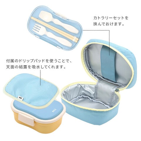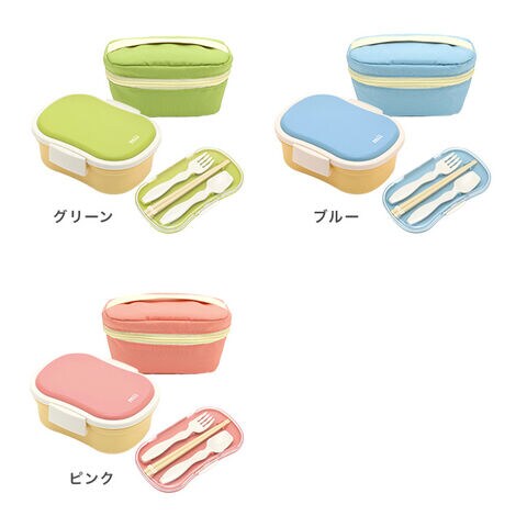 【素材】[弁当箱本体・中子・留め具]ポリプロピレン(耐熱140℃、耐冷-20℃) [保冷ブタ]ABS樹脂(耐熱60℃、耐冷-20℃) [パッキン]シリコーンゴム [ポーチ本体生地・裏生地]ポリエステル [中芯]ポリウレタン [ドリップパッド]ポリエステル [カトラリーケース本体]ポリプロピレン(耐熱60℃) [ケース蓋]AS樹脂(耐熱90℃) [箸・スプーン・フォーク]PBT