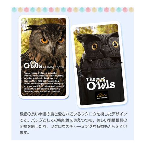 近年、ペットとしても人気のミミズク(フクロウ)デザインのグッズを取り揃えている、モーションクリエイションズ The owls のおしゃれなバッグです。