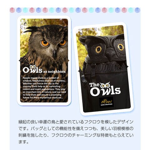 近年、ペットとしても人気のミミズク(フクロウ)デザインのグッズを取り揃えている、モーションクリエイションズ The owls のおしゃれなバッグです。