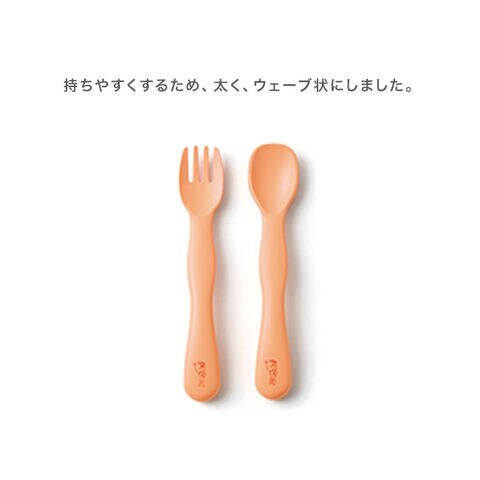 カトラリーは小さいお口でも食べやすい、スプーンとフォークのセット。持ちやすいように、持ち手が太く、ウェーブ状になっています。
