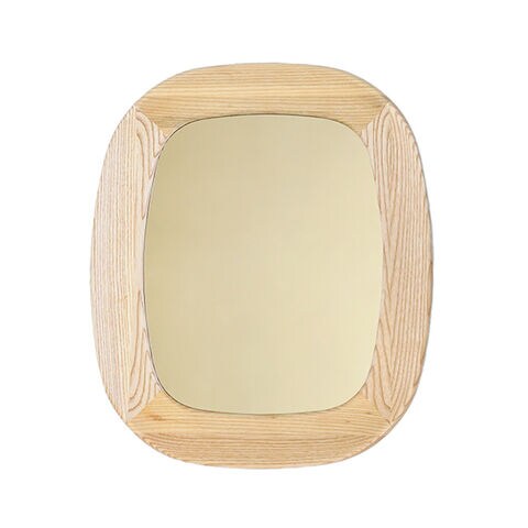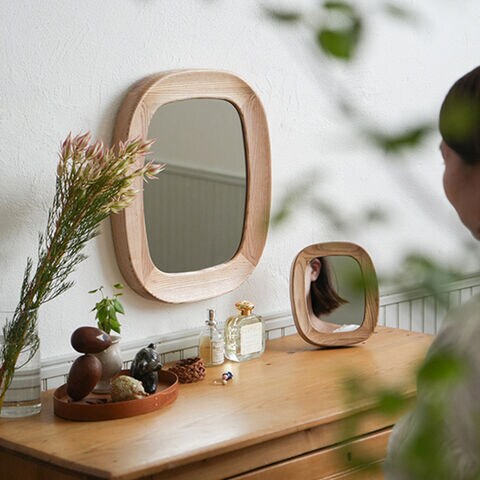 ヨーロッパのアンティークミラーを思わせる丸みのあるフォルム。ふっくらとした木枠の厚みと、天然木アッシュ材のぬくもりが、空間にあたたかさとやさしさを添えます。