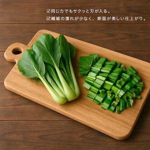 切れ味良く研ぎ上げられ、刃が薄いため食材への食い込みが良い鋼包丁です。軽い力でスッと刃が入り、繊維のつぶれが少なく、美しい断面に仕上がります。