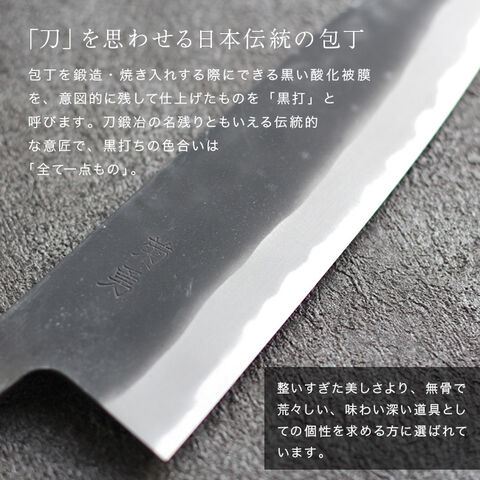 日本の伝統「刀」を思わせる黒打を採用。包丁を鍛造・焼き入れする際に生じる黒い酸化被膜を、あえて残して仕上げたものを「黒打」と呼びます。刀鍛冶の名残ともいえる伝統的な意匠で、黒打の色合いは全て一点もの。整いすぎた美しさではなく、無骨で荒々しい味わいを「道具の個性」として求める方に選ばれています。