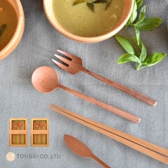 天然のサオの木を使用した、ナチュラルな風合いのスプーン、フォーク、ナイフ、箸のセット。木製のシンプルなカトラリーセットは使いやすく、カフェメニューなどおしゃれな食卓にもピッタリです。