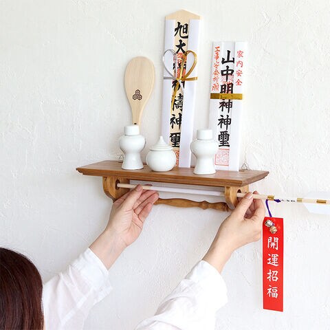 棚板の溝には、最大3枚の神札を立てて納める事ができ、置き場所に困りがちな破魔矢も棚板の下に挿して納められます。