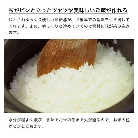 じわじわゆっくり優しい熱伝導が、お米本来の旨味を引き出してくれます。また、ゆっくりと冷めていくので素材に味が染み込みます。