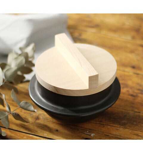 土鍋下部は熱が均一に伝わるように絶妙に丸く仕上げ、木蓋は丈夫で長持ちするヒノキを採用。