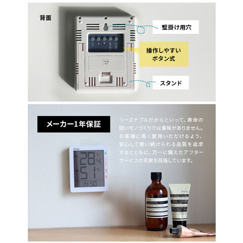 また、室内の温湿度計としてはもちろん、デジタル時計としても◎。シンプルにはっきりと温度や湿度、時間が表示されるので高齢の方でも見やすく、幅広い年代に分かりやすくお使い頂けます。