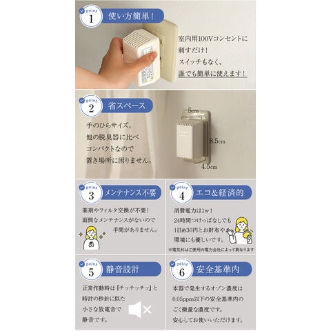 コンセントがある室内であれば、どこでもお使い頂けます。室内用100Vのコンセントに差し込むだけです。一般の空気清浄機と違い、フィルターの交換やお手入れが無く、放電音もとっても静か。オゾン放出もごく微量で安全基準内のオゾン脱臭器です。